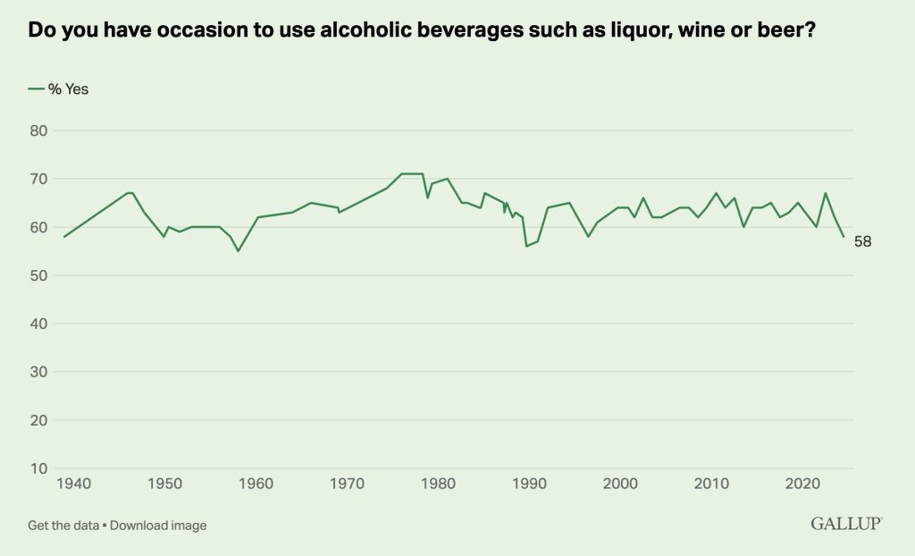 For nearly a century (!), approximately 60 percent of alcohol consumers have maintained their frequent drinking habits. This stability is seemingly backed up by a Gallup survey from August 2024, which found that 61% of drinkers had consumed alcohol within the past week.
